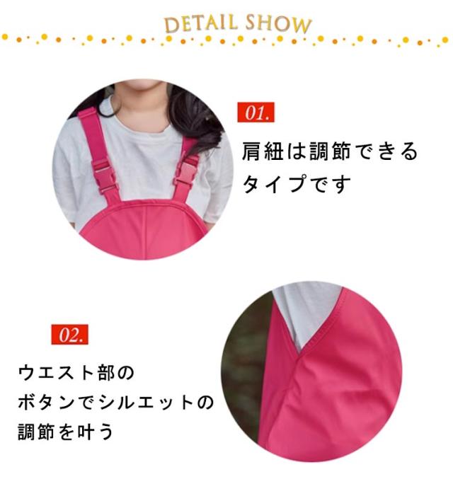 | 砂遊びや水遊び安心!子供用防水サロペットパンツ。 ウエスト部のボタンでシルエットの調節を叶う 肩紐は調節できるタイプです 裾にゴムが入り、体に程よくフィットします オールシーズン使えるゆったりとしたサイズ感、 普段の通学通園はもちろん、遊びや海辺などのシーンに大活躍間違いない | |