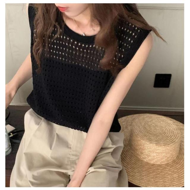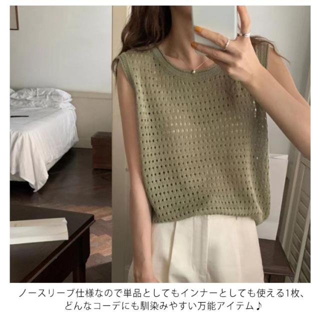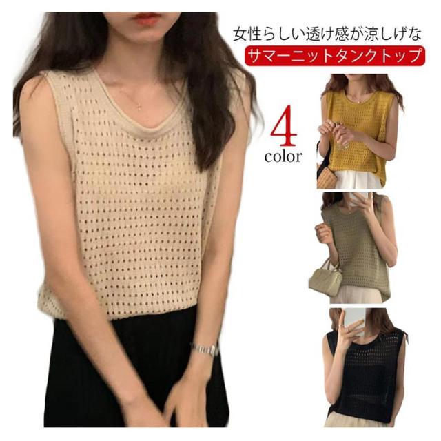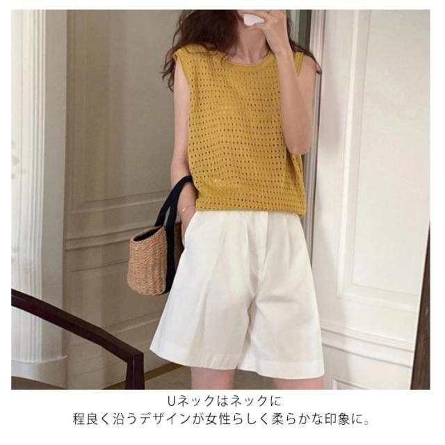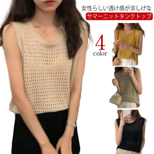 タンクトップ ノースリーブ 送料無料 サマーニット リブニット カットソー tシャツノースリーブ ニット 透かし編み カジュアル Uネック 袖なし シンプル きれいめ 通勤 おしゃれ セクシー かわいい レディース