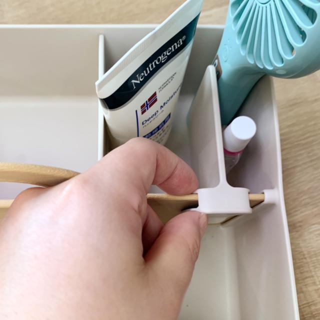 仕切りが細かく分かれているので、スキンケア用品やコスメ、メイク道具の収納に最適です。光のあたり具合やその日の気分でメイクする場所を変えたい時に、サッと持ち運びができるのでおすすめです。