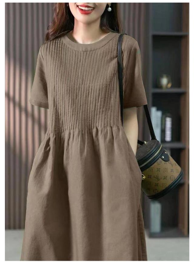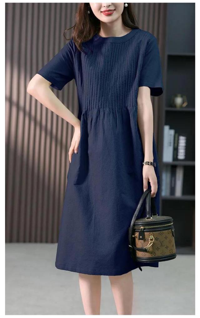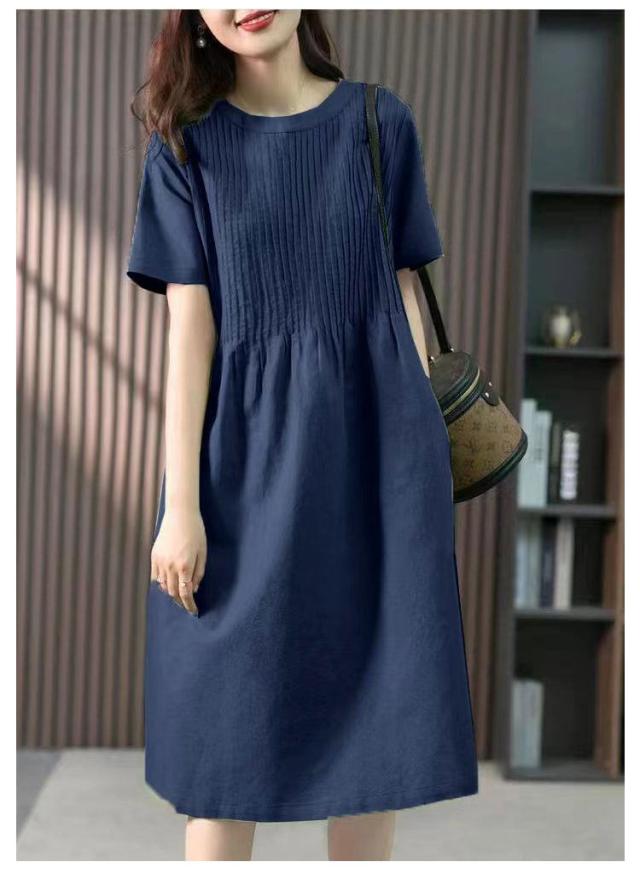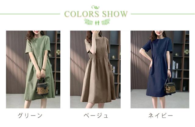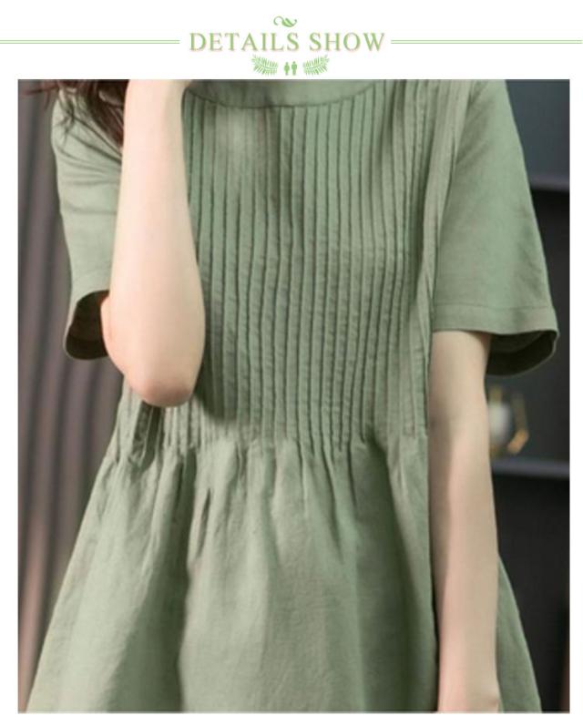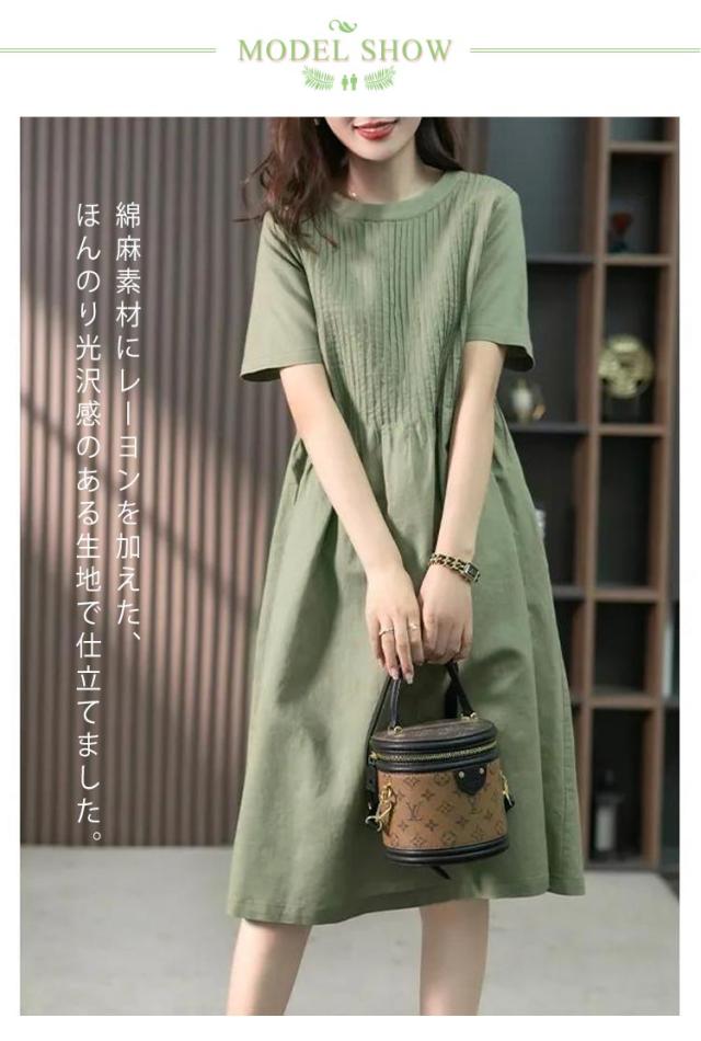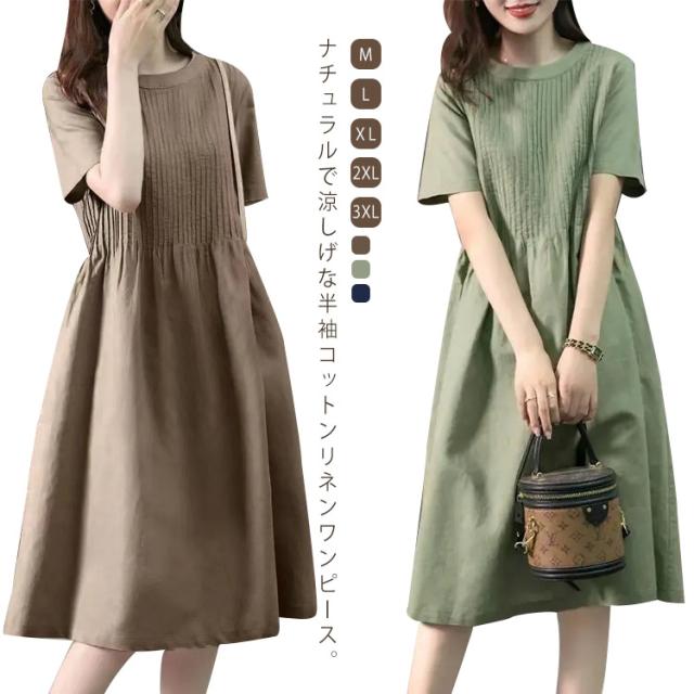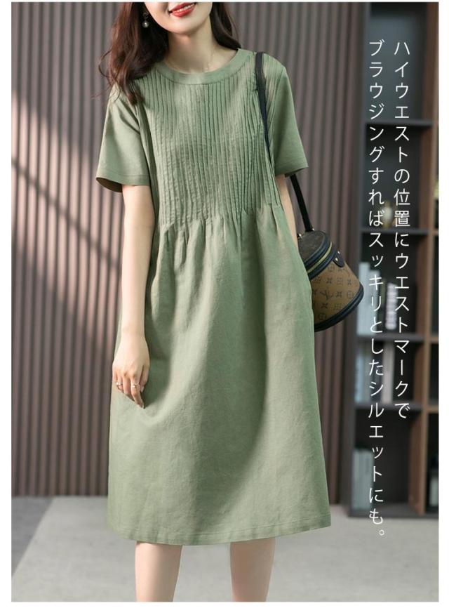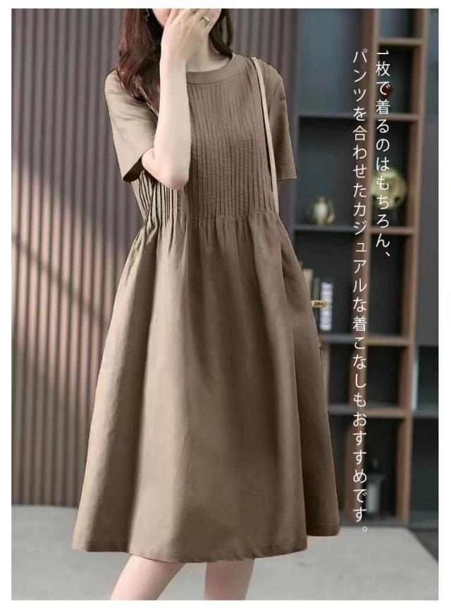 麻 ロングTシャツ ゆったり ギャザー ブラウジング クルーネック プリーツ ロングワンピース チュニックワンピース 切り替え リネン レディース ロングワンピース リラックス Aライン Tシャツワンピース ロングワンピース 大人可愛い 半袖