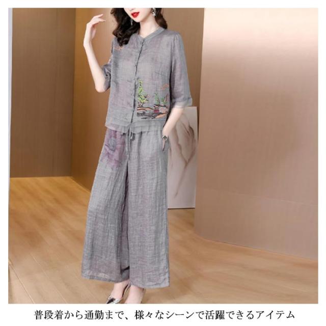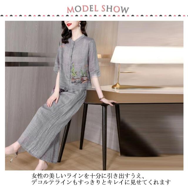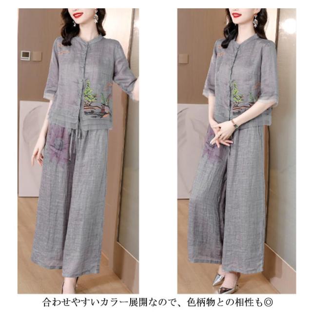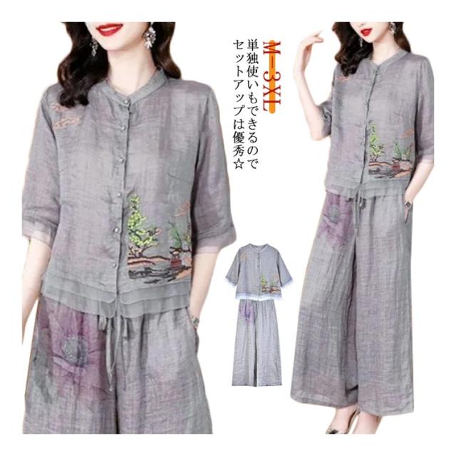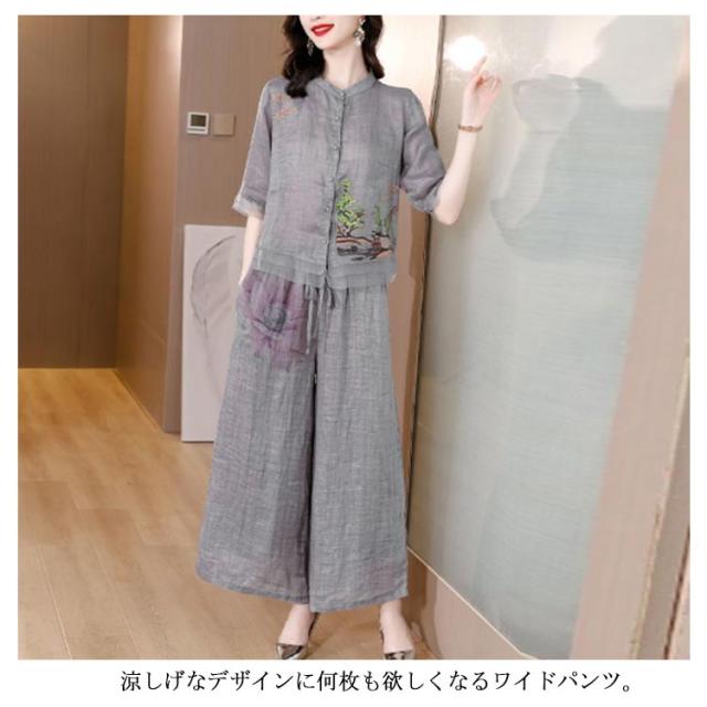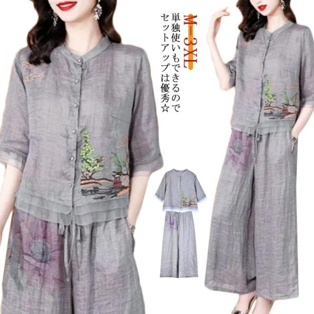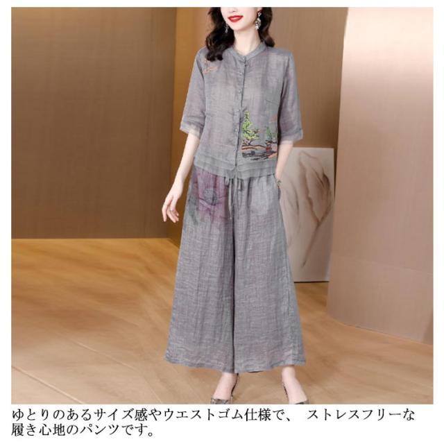 パンツ セットアップ レディース ブラウス 綿麻 ワイドパンツ カジュアル きれいめ サルエルパンツ 上下セット 半袖 ゆったり 体型カバー 美シルエット 美脚 パンツスーツ 夏 部屋着 カジュアル 着痩せ 通勤 春 ビジネス 仕事 通勤 OL ルームウェア リネン