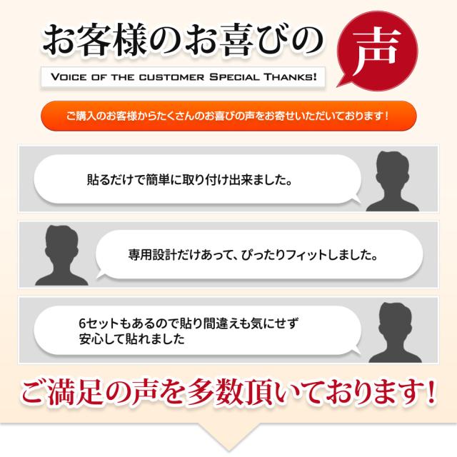 | ■無理に引っ張りすぎるとフィルムが伸びてしまい、フィッティングが悪くなる可能性がありますので、引っ張りすぎないようにご注意ください。 ■貼り付け面にワックスなどの油分が残っていると粘着力が弱まる可能性があります。付属の脱脂シートでしっかり脱脂をしてから施工してください。 ■貼り付け前に必ず仮合わせを行い、貼り付ける場所とフィルムを確認してから貼り付けを行うようにしてください。 ■台紙から剥がした場合は返品対象外となります。 ■すぐに使用しない貼り替え用のセットは、平らな場所で広げて保管してください。丸めたまま保管されると台紙から剥がれてくる可能性があります。 |
