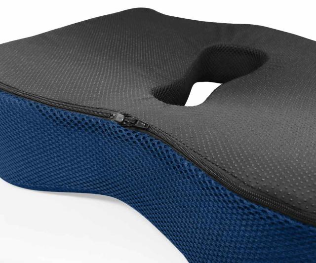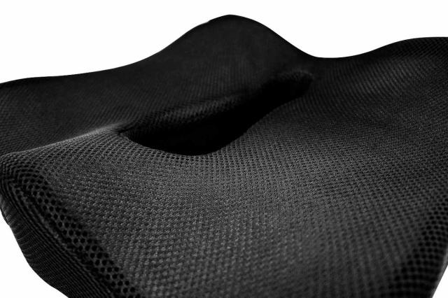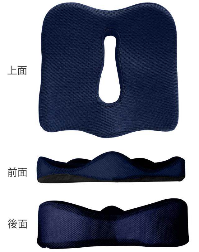 おしりの形にフィットするように設計された立体形状のクッションです。体にぴったりフィットする3D構造が長時間座っても疲れにくく、ゆるやかな傾斜が背骨を自然に伸ばし、太もも裏にかかる体圧を効率よく分散します。