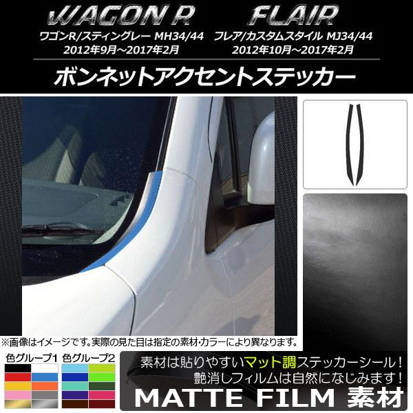 ボンネットアクセントステッカー マット調 スズキ/マツダ ワゴンR/スティングレー,フレア/カスタムスタイル 色グループ1 入数:1セット(2枚) AP-CFMT976 色グループ1: ブラック ホワイト レッド ブルー イエロー オレンジ ピンク グレー ゴールド シルバー