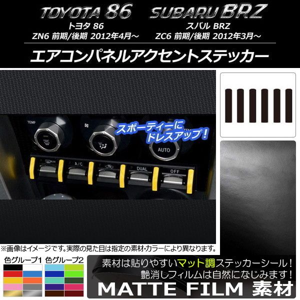 エアコンパネルアクセントステッカー マット調 トヨタ/スバル 86/BRZ ZN6/ZC6 前期/後期 2012年3月〜 色グループ1 入数:1セット(6枚) AP-CFMT2226 色グループ1: ブラック ホワイト レッド ブルー イエロー オレンジ ピンク グレー ゴールド シルバー