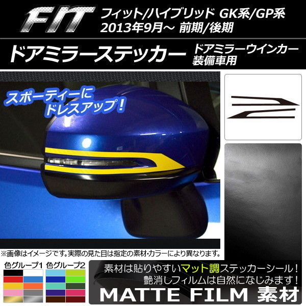 ドアミラーステッカー マット調 ホンダ フィット/ハイブリッド GK系/GP系 前期/後期 色グループ1 入数:1セット(2枚) AP-CFMT2319 色グループ1: ブラック ホワイト レッド ブルー イエロー オレンジ ピンク グレー ゴールド シルバー