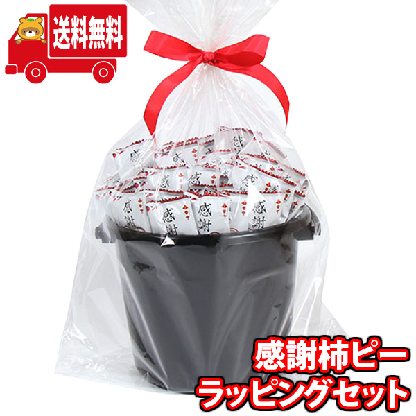 感謝の文字がデザインされた「感謝柿ピー」をかわいいバケツに詰めました。
