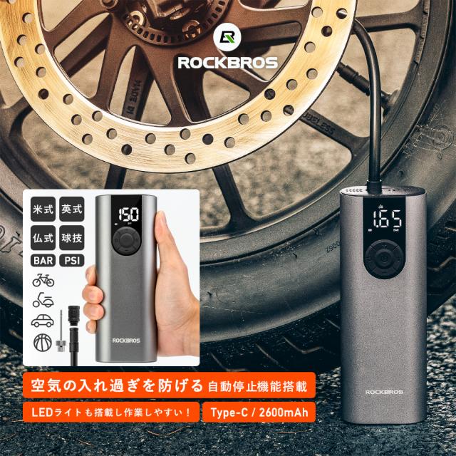 空気入れ 電動 自転車 自動車 バイク 車椅子 充電式 自動停止 空気圧調節機能搭載 LEDライト付き ロックブロス ROCKBROS