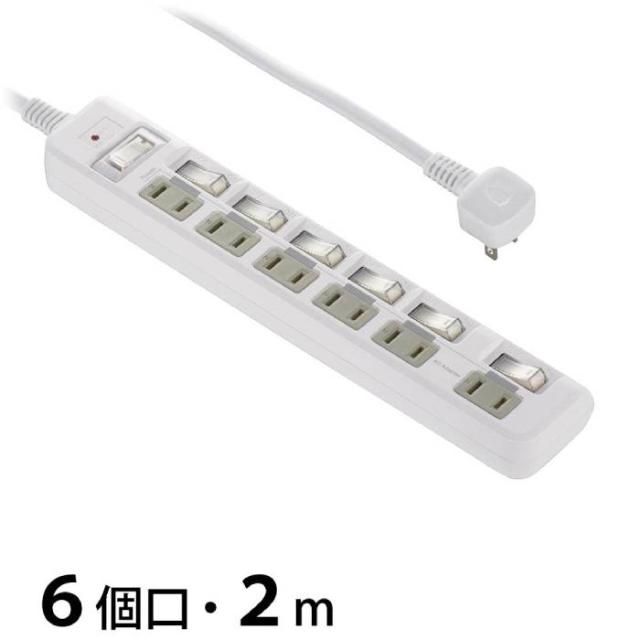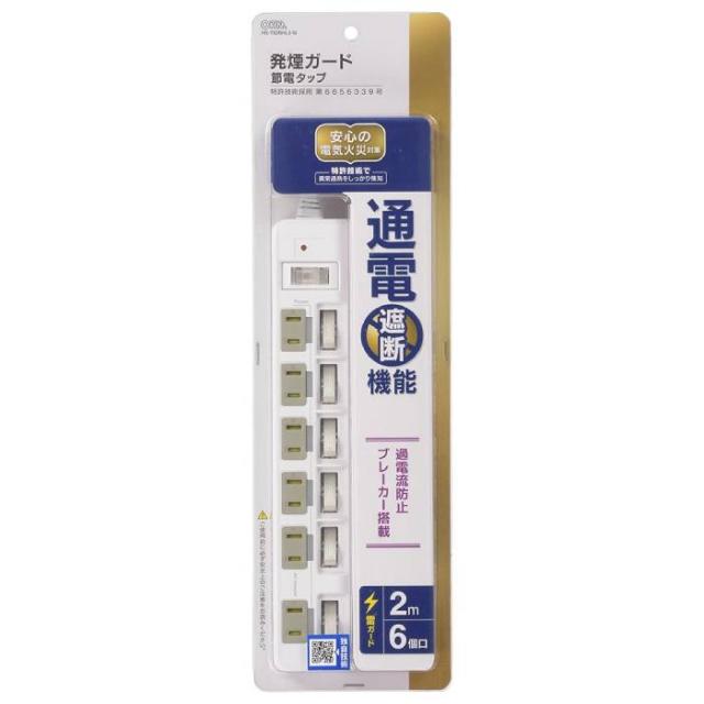 発煙ガード節電タップ 6個口 L型プラグ コード長2m 1500W以下 過電流防止ブレーカー付 個別スイッチ付 ホワイト OHM HS-T62BHL3-W
