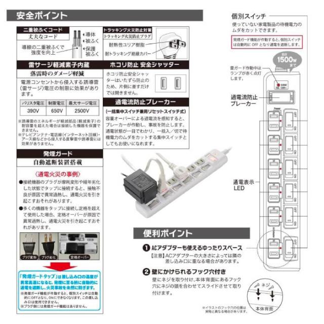 ●特許技術で異常過熱を検知、通電火災からしっかり守る。 ●差し込み口の温度が異常高温になると自動的に通電を遮断(特許第6656339号採用)。 ●過電流防止ブレーカー付き(一括集中スイッチ兼用リセットスイッチ式):容量オーバーによる過電流を感知するとブレーカーが作動、過電状態が一目でわかり一括入/切で待機電力のムダをカットする集中スイッチ兼用。 ●個別スイッチ付き:使っていない家電製品の待機電力のムダをカット、発煙ガード機能が作動すると個別スイッチは自動的にOFFとなり通電を遮断。 ●雷サージ軽減素子内蔵:落雷時のダメージを軽減、電源コンセントから侵入する誘導雷(雷サージ)電圧の制限に効果があります。 ●ホコリ防止安全シャッター付き:いたずら防止のため片側に差すだけでは開きません。 ●トラッキング火災防止プラグ:耐熱性ユリア樹脂採用、耐トラッキング絶縁カバー付き。 ●ACアダプターも使えるゆったりスペース。 ●壁にかけられるフック穴付き。 ●各差込み口に通電表示LED付き。