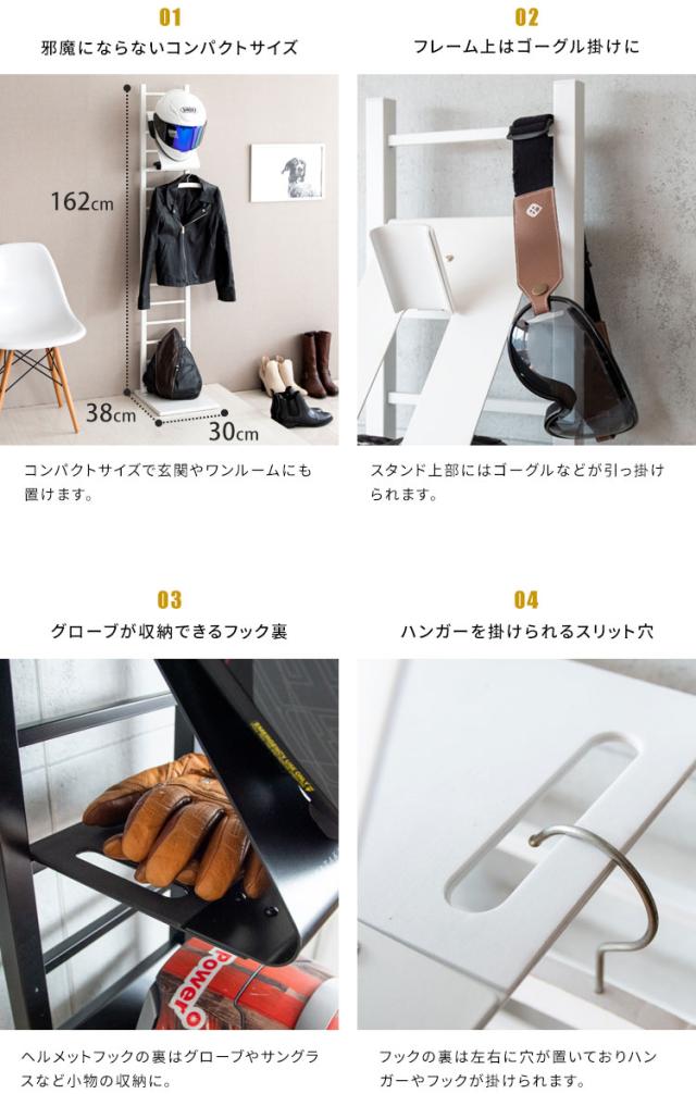 スタンドはグローブなどを置ける収納棚やジャケットを掛けられる仕様でお出かけ時に必要なものをまとめて収納できます。別売りのヘルメットフックを使用すれば最大3個収納可能。