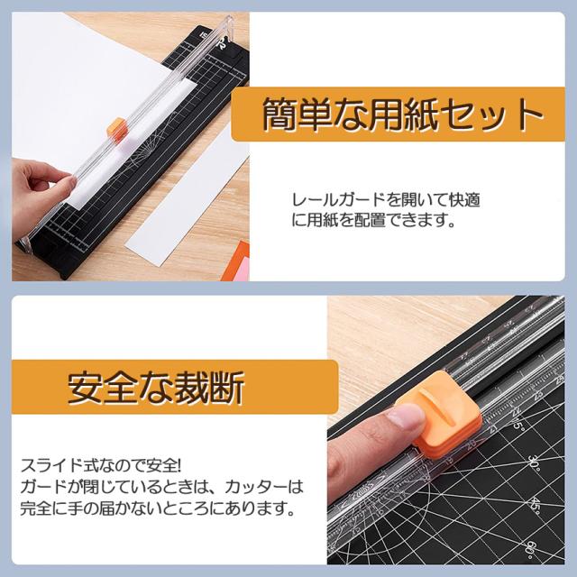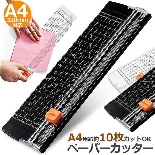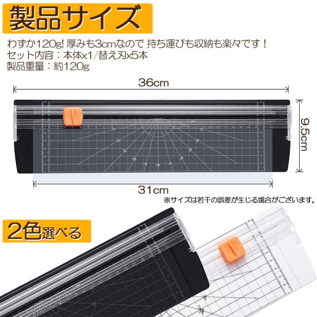 【製品仕様】製品サイズ:310X95X30mm、重量:120g、切断可能サイズ:310mm、ペーパーカッターの適用可能な切断範囲:A4、A5、B5、B6、B7【替え刃付き】替え刃が5本付きで刃が鈍くなると簡単に交換可能です。印刷用紙、写真用紙、カード用紙などの一般的な用紙は簡単にカットできます。