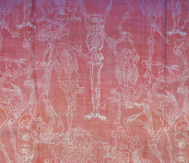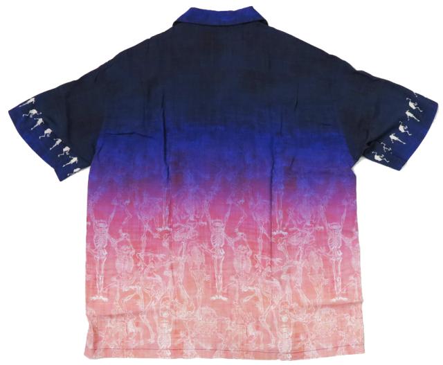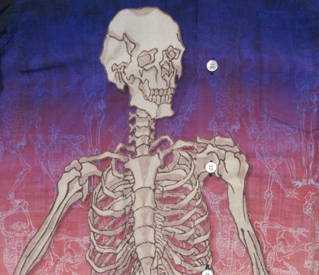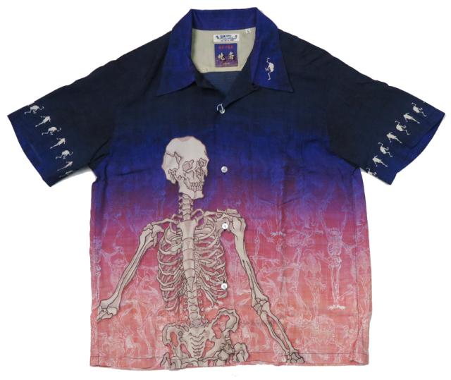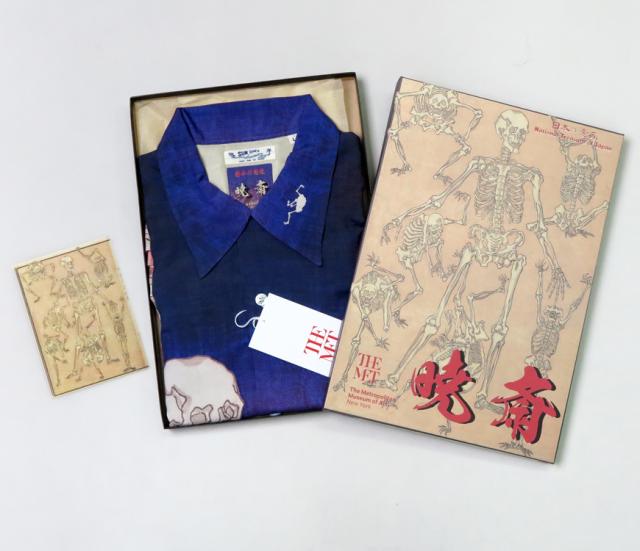 幕末から明治にかけて活躍した浮世絵師、河鍋暁斎。1857年に号の「きょうさい」を名乗り、当初は「狂斎」を使っていたが後に「暁斎」へと改めた。この字からもわかる通り、社会に対しての反発を作品に取り入れ、多くの風刺画を残している。その波乱に満ちた絵師としての歴史は6歳から始まり、当時すでに多くの弟子を育てていた浮世絵師、歌川国芳に入門。そこで人間同士が組み合って喧嘩をしている様を注意深く観察し、動きのひとつひとつを描き出すことを徹底的に学んで自身の才能を開花させていった。 この「暁斎漫画」に描かれているのは骸骨だが、そのような人々の骨格の動きが生き生きと描かれている。サンサーフでは、それらの並びを分解・再構築して躍動感を表現。袖と襟元にもアクセントとして柄を入れ、1950~60年代のアロハシャツにみられる仕様を取り入れた。