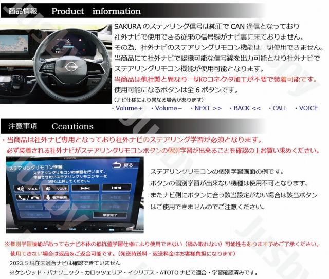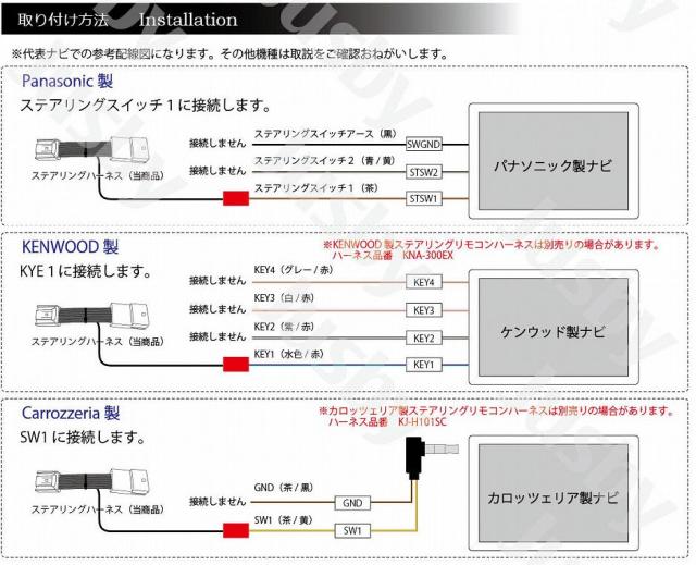 ・社外ナビのステアリング学習機能でステアリングボタンを個別に学習させる必要があります。社外ナビがステアリングリモコン学習に対応している事を確認の上ご注文ください。