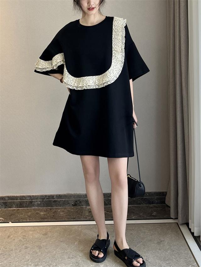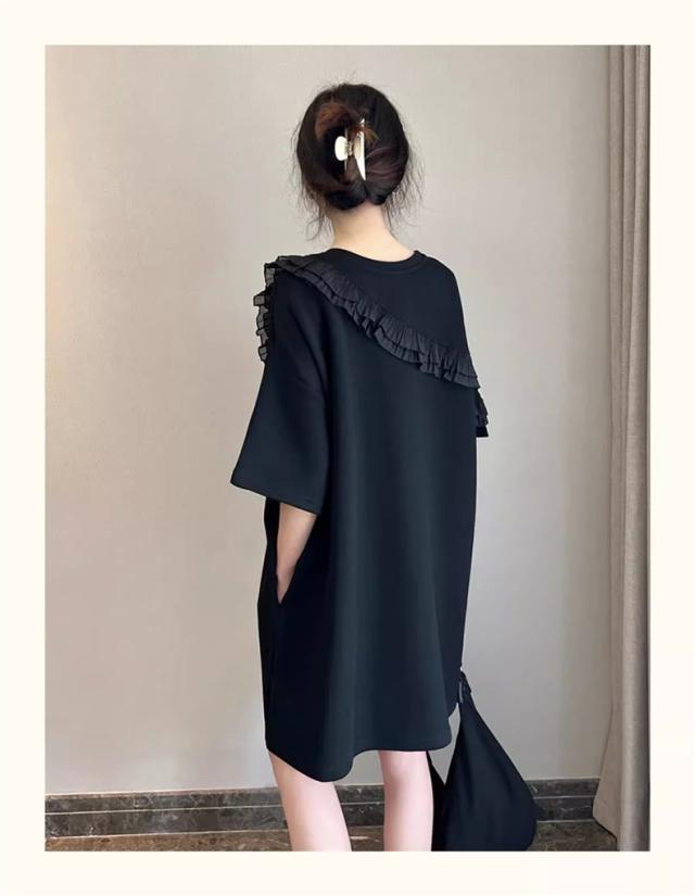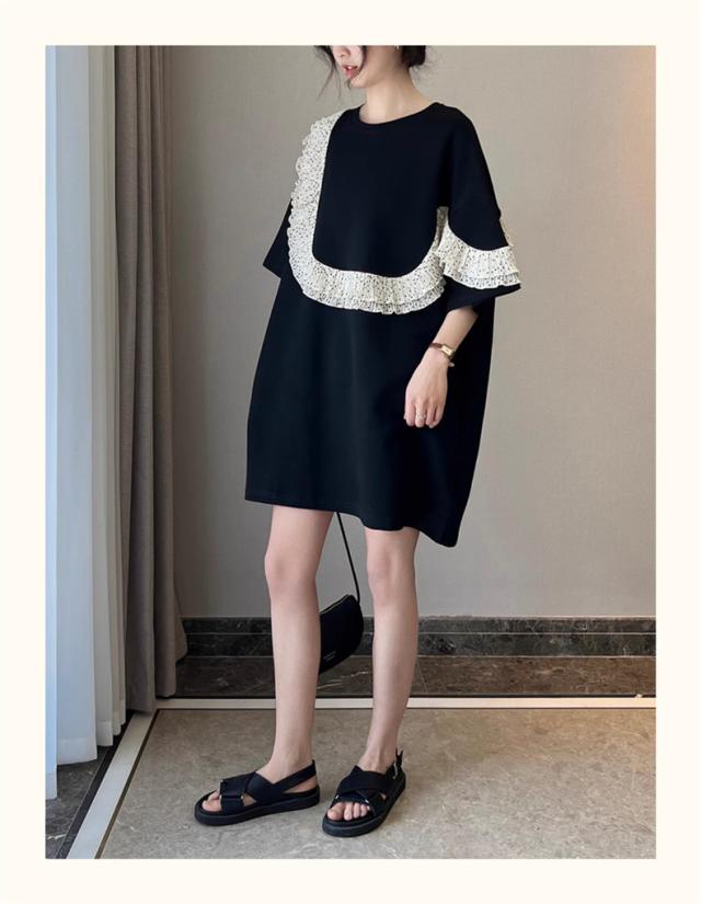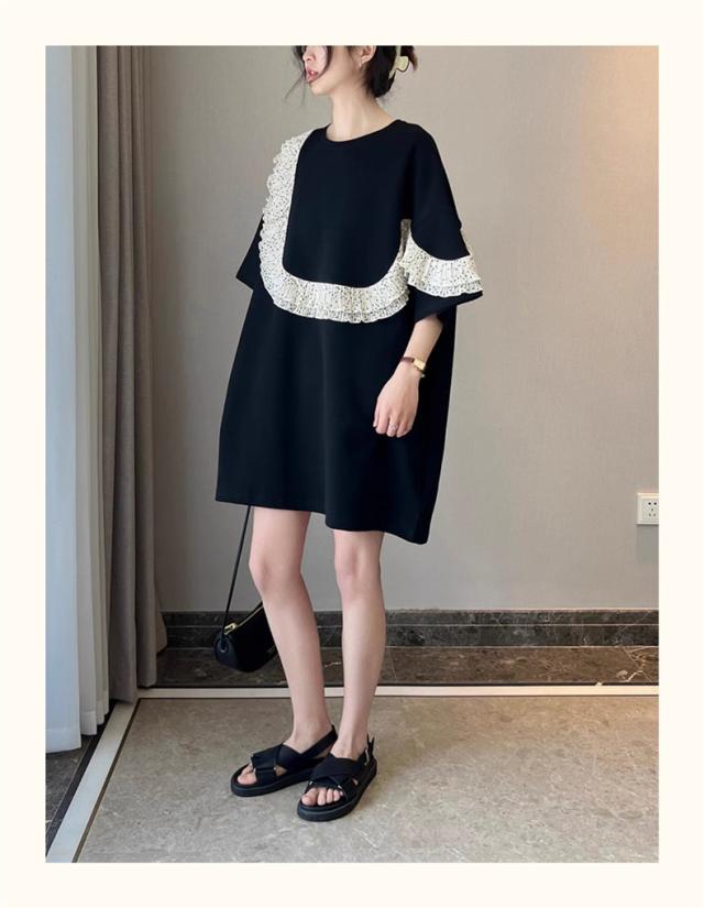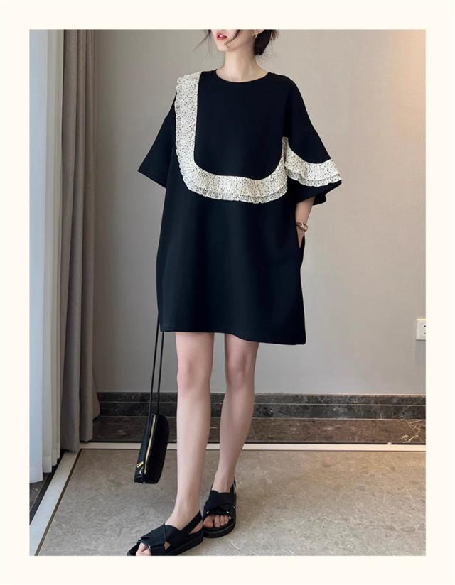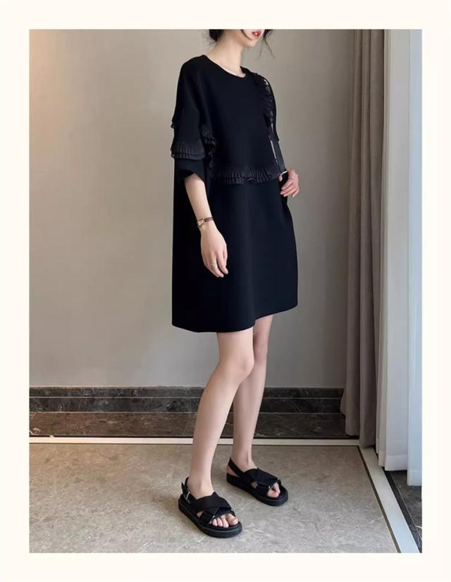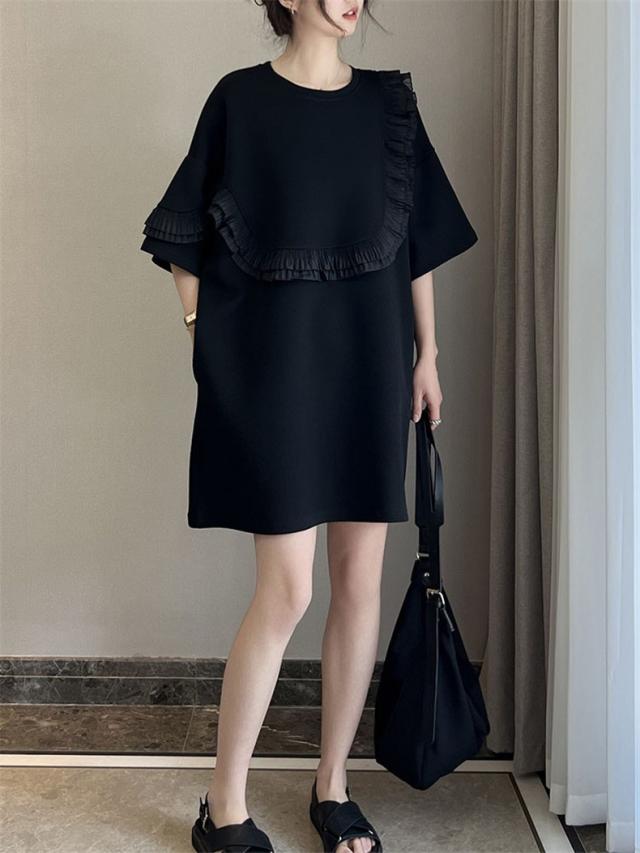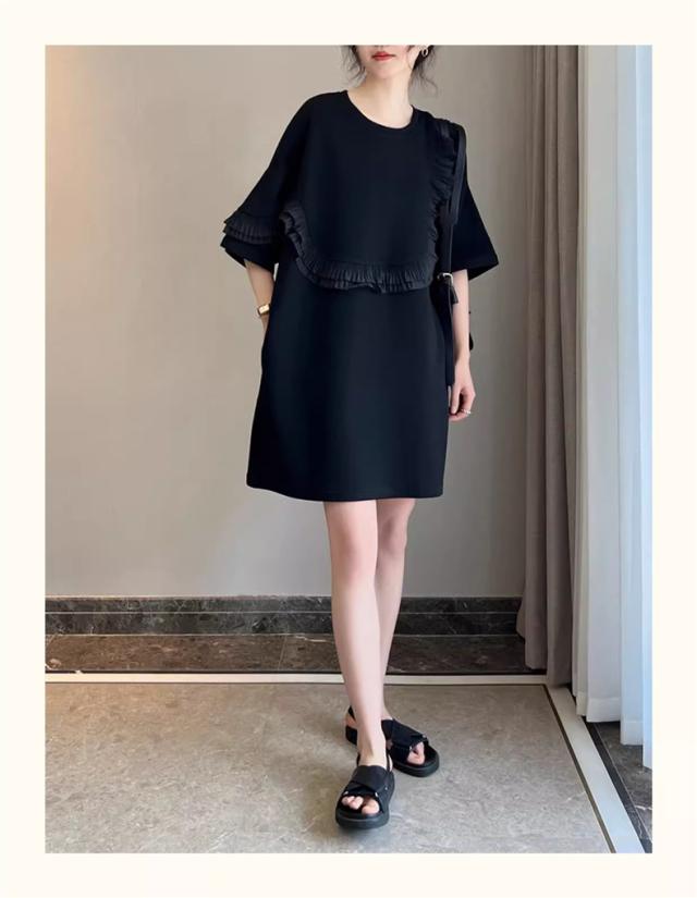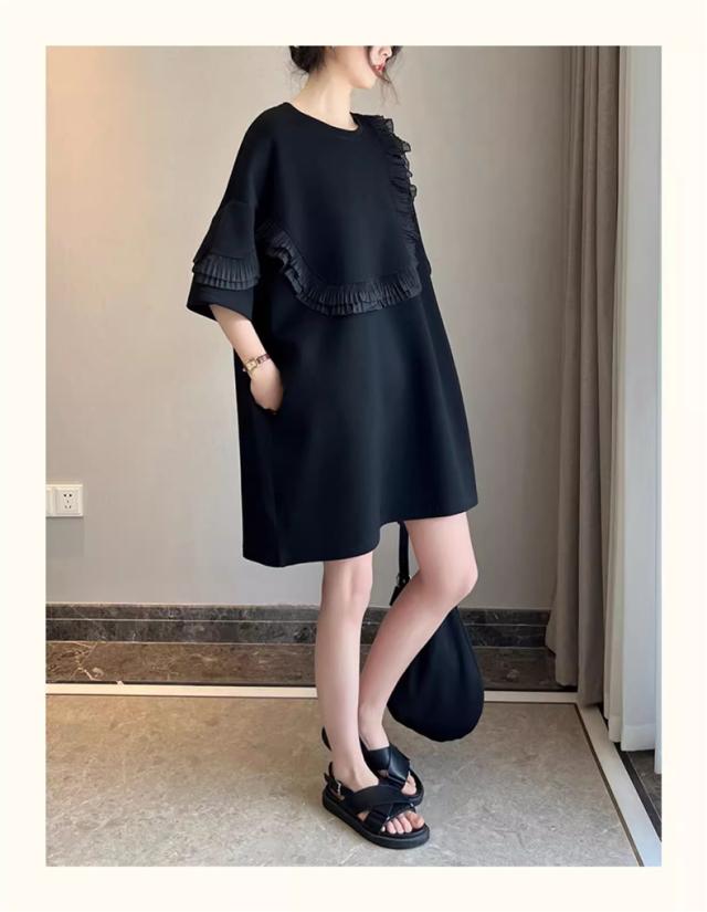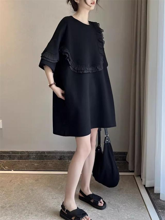 夏ワンピース レディース 丸首 無地 プルオーバー 5分袖 自然に体型カバー 大きいサイズ ダブルフリル 大人っぽく お洒落を楽しめる