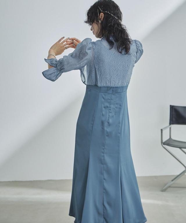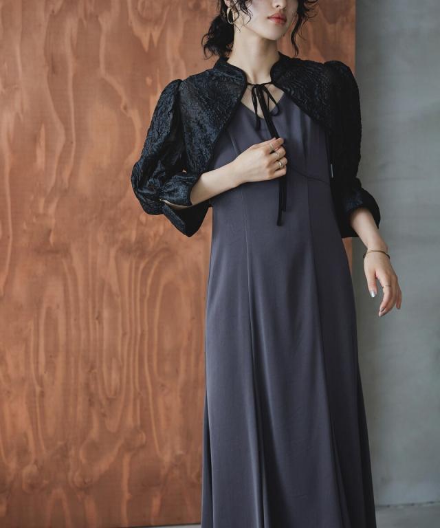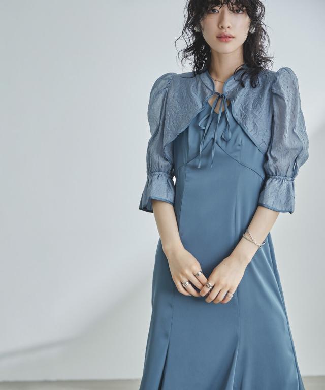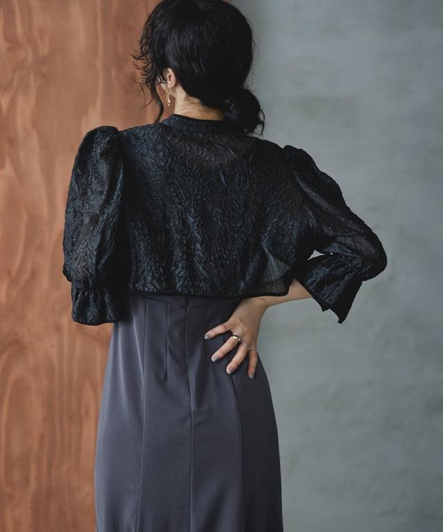 ショート丈ボレロは前後で着回し可能で、程よい透け感が抜け感を与えて
