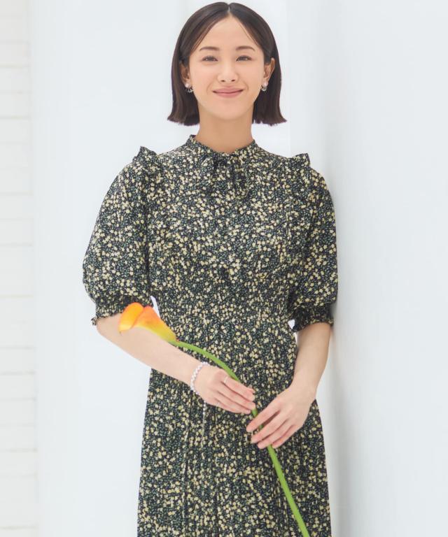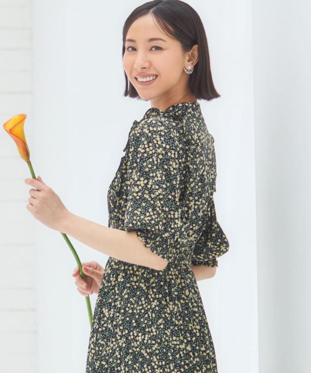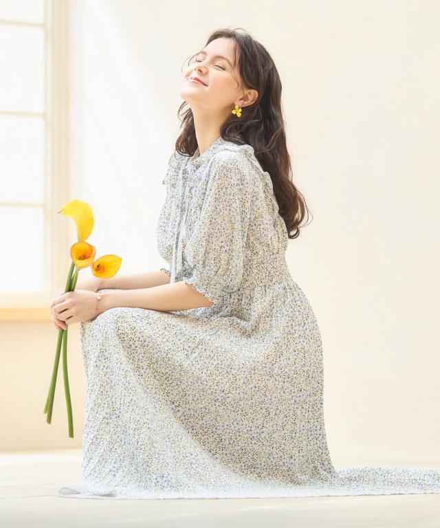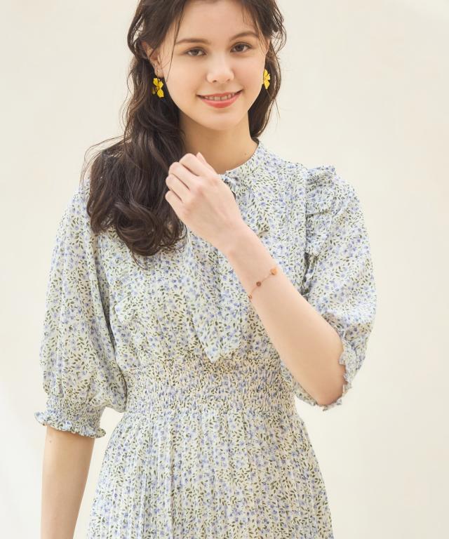 露出控えめの清楚なデザインと春めいたレトロな小花柄の組み合わせで、上品な美しさを引き出します。