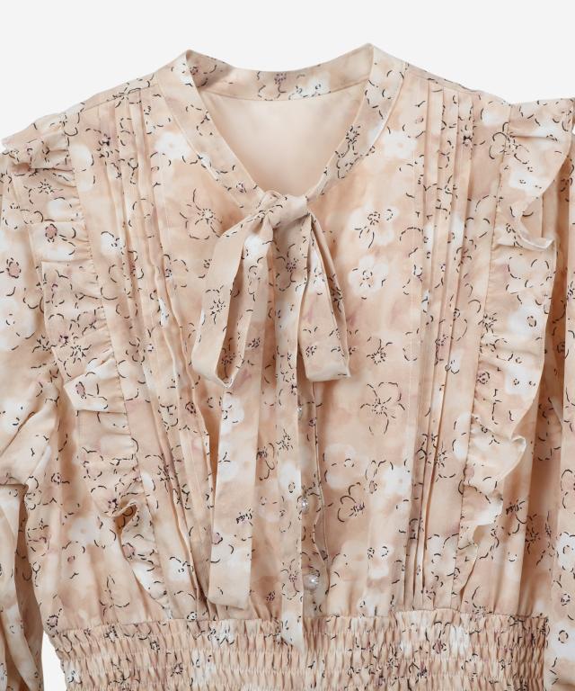 ネックは清楚ながらも顏周りを華やかに飾るボウタイカラー。フロントピンタックやサイドフリルもあしらわれたフェミニンなデザインです。