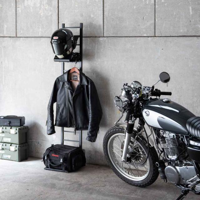 スタンド上にはゴーグルなどが引っ掛けられます。ヘルメットフックの裏側は、グローブやサングラスなど小物の収納に最適です。フック裏は左右に穴があいており、市販のハンガーやフックが掛けられるのでジャケットを掛けられます。ハシゴフレームに市販のS字フックを使えばカバンもかけられます。スタンドベース部分は、カバンや収納ボックスが置けます。