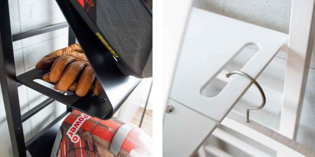 ヘルメットフックの裏側は、グローブやサングラスなど小物の収納に最適です。フック裏は左右に穴があいており、市販のハンガーやフックが掛けられるのでジャケットを掛けられます。フックの位置はハシゴフレームのお好きな位置に設置できます。