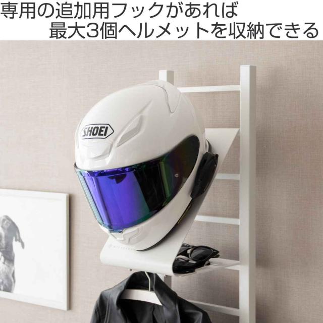同シリーズのヘルメットスタンドに専用フックを使用すれば、最大3個ヘルメットを収納できます。あとから設置できるので、ご購入後いつでも増やせます。