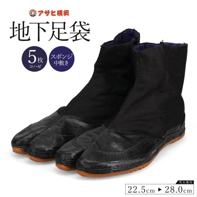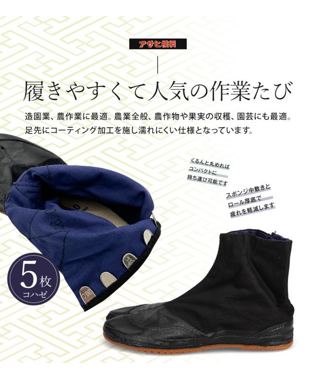 地下足袋 作業用 5枚馳 コハゼ5枚 たび スポンジ中敷き ロール厚底 コーティング 農作業 田植え 造園 園芸 ガーデニング 山菜採り 土木作業 ワークシューズ 祭り 男性 女性 男女兼用 黒 ブラック アサヒ横綱地下足袋シリーズ 5枚馳 GT-5