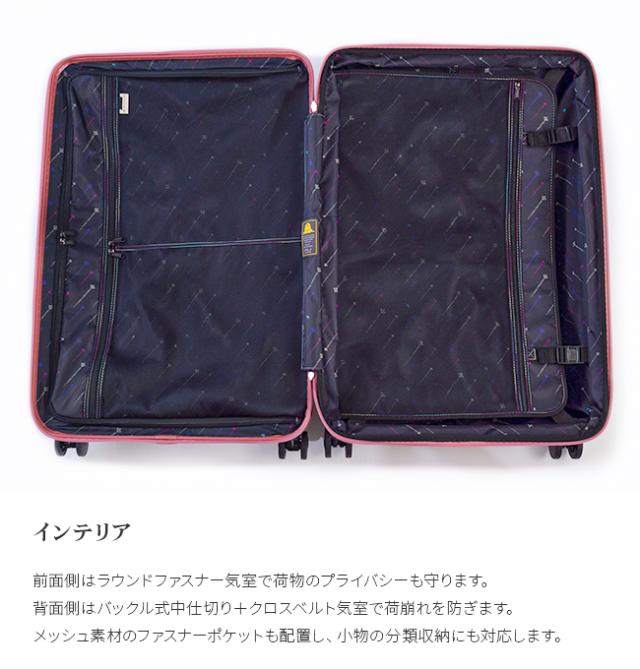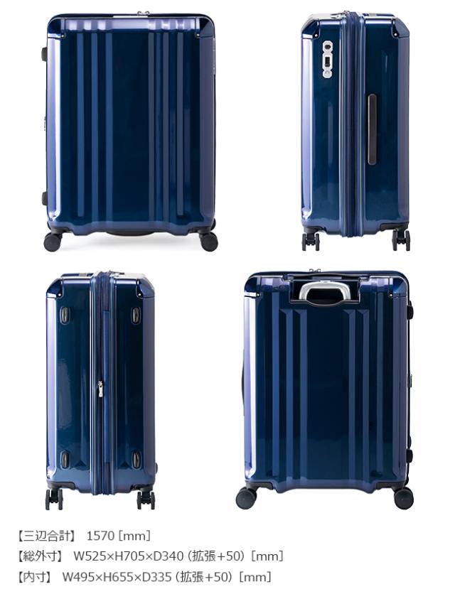 | ブランド |アジア・ラゲージ / Asia Luggage Inc.(A.L.I) シリーズ |デカかるEdge 拡張タイプ 品番 |ALI-088-102 形状 |スーツケース / キャリーケース LLサイズ 総外寸 |W525×H705×D340(拡張+50)[mm] 内寸 |W495×H655×D335(拡張+50)[mm] 重量 |約 4.9kg 容量 |約 102L(拡張+18L) 滞在目安 |10泊〜長期滞在 主素材 |ポリカーボネイト100% 機能 |ファスナー式容量拡張機能 |キャスターストッパー |YKK社製 防犯ダブルコイルファスナー |HINOMOTO製 Lisof® 50×60mm径 |大小輪ダブルホイール静音キャスター |TSAダイヤルロック |シリアルナンバー管理システム ATTENTION ※TSAロックについて このスーツケースのTSAロックはダイヤルコンビネーションロックです。鍵穴はTSA職員が緊急の際に解錠して検査を行うためのものであり、差し込み式のキーは付属しておりません。 |