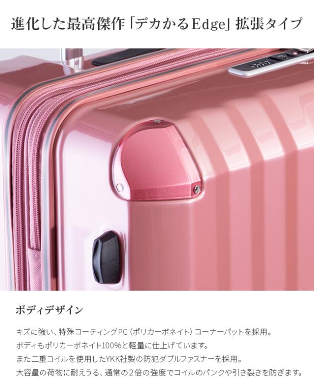 | more advanced, more fashionable. たっぷり入って軽い、が自慢の「デカかる」をさらに進化させたモデル。軽量だけでなく、強度を誇るボディ素材はポリカーボネイト100%。しなやかに動くダブルホイールキャスターで、ストレスフリーな使い心地です。『デカかるEdge』はストッパー機能・拡張機能など搭載した最強のキャリーケース! キャリーケース選びにお困りの方は、この一台に限るでしょう。 ■ボディデザイン キズに強い、特殊コーティングPCコーナーパットを採用。ボディもポリカーボネイト100%と軽量に仕上げています。 ■拡張機能 荷物が増えた際に便利な拡張機能付き。拡張ファスナーを広げてご利用ください。※※拡張時は手荷物預け入れ無料サイズではありません。予めご了承ください。 ■ダブルコイルファスナー 二重コイルを使用したYKK社製の防犯ダブルファスナーを採用。大容量の荷物に耐えうる、通常の2倍の強度でコイルのパンクや引き裂きを防ぎます。 ■ホイールロックスイッチ 電車内・坂道などで便利なホイールロックスイッチ付きです。本体側面のスイッチで簡単にロック・解除が行えます。 ■50×60mm径ダブルホイールキャスター 静音性に優れた素材『Lisof®』を採用したHINOMOTO製キャスターを採用。計8輪で支え、抜群の走行安定性・旋回性を誇ります。石畳や点字ブロックなどの、段差のある路面で実力を発揮します。前輪に50mm径・後輪に60mm径のキャスターの大小輪仕様のためストッパー機能使用時の二輪走行もラクに移動が可能となりました。 ■TRAVEL SENTRY ダイヤルファスナーロック 破損しにくいボディ埋め込み式TSAロックを採用。ダイヤル式なのでキーを持ち歩く煩わしさがなく、紛失の心配もありません。 ※本製品にはキーは付属しておりません。スライドロックの鍵穴は、TSA職員が検査する際に使用するものです ■インナーデザイン 洗練されたカラーリング。荷崩れのしにくいランニングファスナーで、使いやすさを実現。グラデーションのステッチと飛行機柄でさりげない遊び心を演出しています。 ■シリアルナンバー管理システム たくさんのお客様の声にお応えし、1台1台にシリアルナンバーを刻印。個体管理システムを導入しました。アフターケア・メンテナンス等を迅速かつ的確に行うため、業界初のアフターを実施します。 |