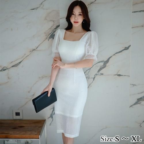 【グラシア】 キャバ ドレス キャバドレス ワンピース ミディアムドレス スクエアネック デコルテ メッシュ 華奢 レース パフスリーブ 純白 ホワイト S M L XL