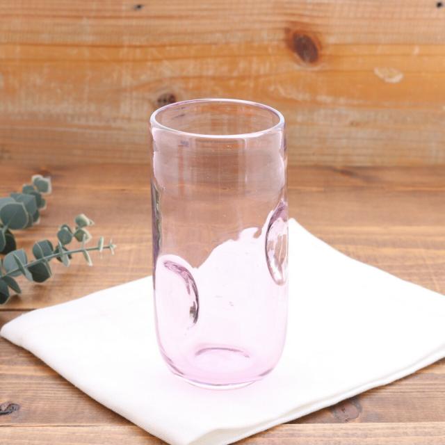 手吹きの手作り感が味わい深く、ピンク色でかわいい印象のガラス製グラスです。