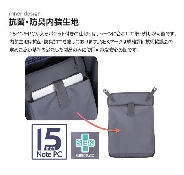 ■15インチPCが入るポケット付きの仕切りは、シーンに合わせて取り外しが可能です。
