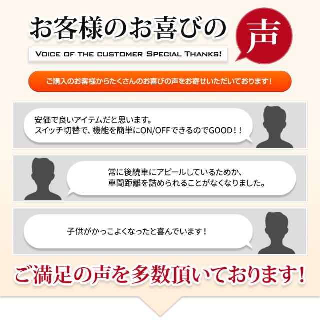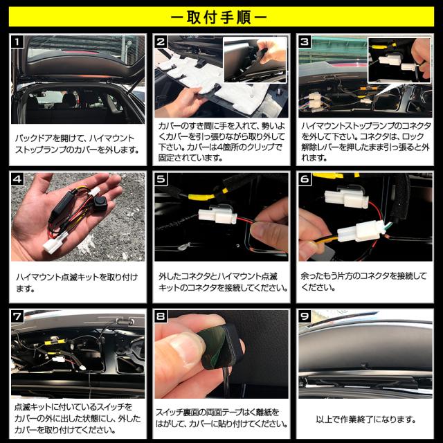 装着する事で、ハイマウントが自動的にポンピングブレーキのように点滅します。 ハイマウントを点滅させることで後続車からの認識性アップ。 『ON/OFFスイッチ付き』だから車検時には電源OFFで純正に戻すことが可能です! 【点滅の仕方について】 ブレーキペダルを踏むと、初めにパッパッパッパッと4回点滅し、 その後はブレーキペダルを踏み続けている間点灯し続けます。 【取付けについて】 ハイマウントのコネクタの間に本品を割り込ませるだけの簡単取付! 車種専用のコネクタを使用しているため純正の配線を傷つけずに取付が可能です。 |