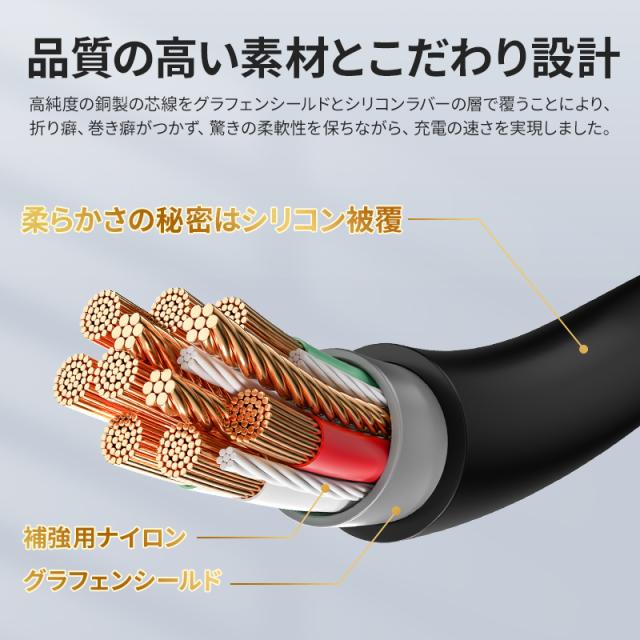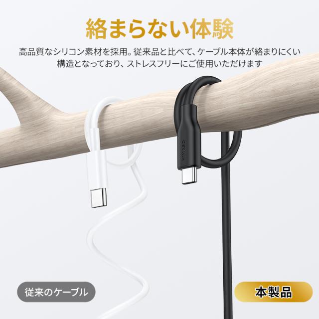 品質の高いシリコン素材を採用しており、PVCシースとTPEシースのケーブルで柔らかくて、触り心地が抜群。また。ほかのケーブルに比べて絡まりにくく、巻き癖も付きにくい。ストレスなくお使いいただけます。