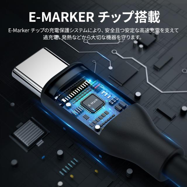 本ケーブルにはeMarkerが内蔵されており、USB PD(Power Delivery)での送電の際にはケーブル内のeMarkerから読み出された情報と、送電側機器、受電側機器の状況を考慮して最適な電力制御が行われるようになっています。