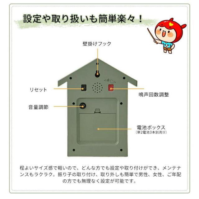 毎時間、優しいカッコーの鳴き声で時間をお知らせ。