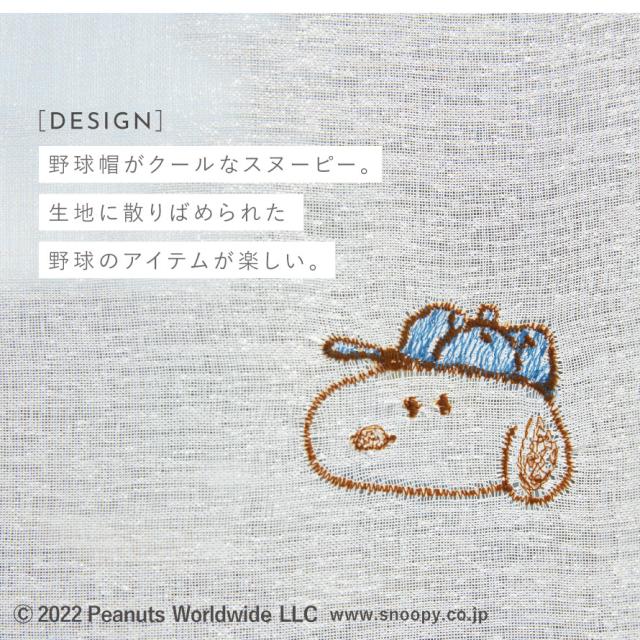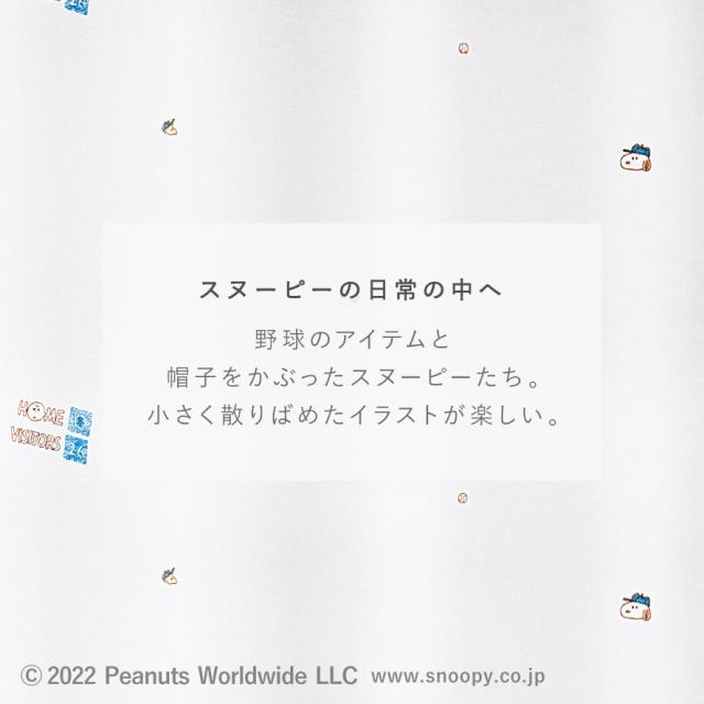 野球のアイテムをちりばめたデザイン。野球帽をかぶったスヌーピーとウッドストックが可愛らしい。柔らかいホワイトの生地色なので、優しくナチュラルなインテリアにもよく合います。