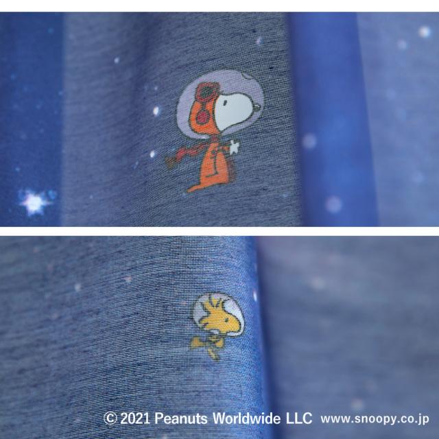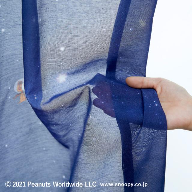 宇宙飛行士姿のスヌーピーとウッドストックが可愛らしいレースカーテン。深いネイビーのグラデーション、光に透かすと星が光っているように見えます。