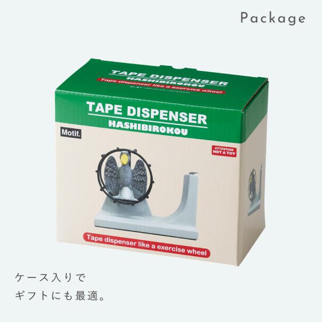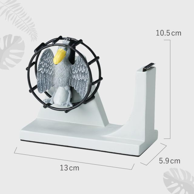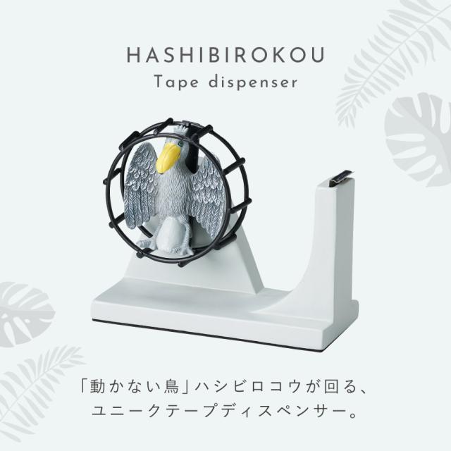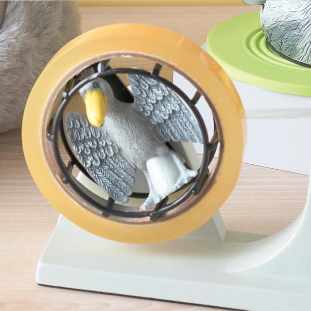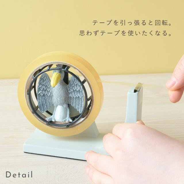 回し車がモチーフ。テープの回転部分にリアルなハシビロコウがデザインされた、ユニークな卓上型テープカッターです。「動かない鳥」として大人から子供まで人気のハシビロコウ。