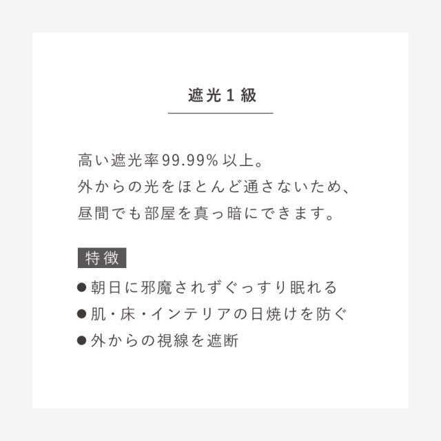 遮光1級で、高い遮光率99.99%以上。遮光1級や完全遮光は外からの光をほとんど通さないためお部屋を真っ暗にできます。昼間でも人の顔の表情がわからないくらいにお部屋が暗くなり、朝日に邪魔されずにぐっすり寝たい、昼寝のときに部屋を真っ暗にしたい、夜勤があるので昼間に明るさを気にせずぐっすり眠りたい方などにも最適です。寝室やシアタールームにもおすすめ。紫外線もカットするので、肌やフローリング、家具を日焼けから守ります。遮熱・断熱率も高く、冷暖房の効率が良くなります。