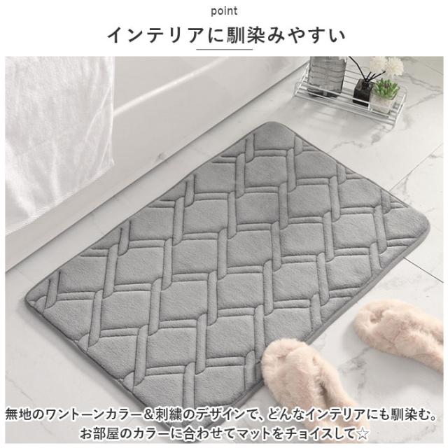 | 商品説明 | ・インテリアに馴染みやすいデザインのふかふかバスマット♪ 【足元ふかふか】 ・低反発素材で足元ふかふか!踏み心地快適なバスマット。 【インテリアに馴染みやすい】 ・無地のワントーンカラー&刺繍のデザインで、どんなインテリアにも馴染む。お部屋のカラーに合わせてマットをチョイスして☆ 【すべすべ肌触り】 ・表面はすべすべで優しい肌触り。ベタベタしないのでお風呂上りもさわやか♪ 【滑り止め】 ・マットの裏面には床面をしっかりグリップする滑り止め加工済み。お子さまが滑る心配が少ないので安心。 【使い方は自由】 ・浴室足拭きマットだけでなく、玄関やお部屋のインテリアのアクセントとしてもOK! |