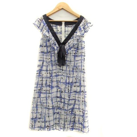 【中古】J&R ワンピース Vネック ノースリーブ ひざ丈 チェック柄 総柄 リボン M オフホワイト 青 ブルー レディース
