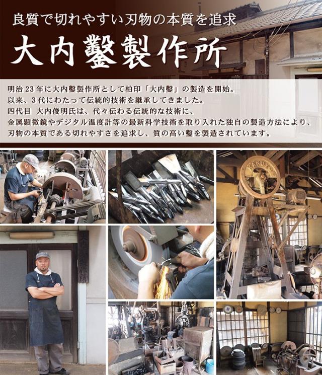 大内鑿 黒口金 グミ柄 追入鑿 5本組 スリ合わせ無 桐箱入(三分(9mm)、五分(15mm)、八分(24mm)、一寸(30mm)、寸二(36mm))■商品説明■ 四代続いている言わずと知れた 播州三木でトップブランドの鑿鍛冶製品です。 昔ながらの製法で一本一本丁寧に作っている、 四代目大内俊明さんの精魂込めた鑿をご堪能下さい。※職人名の桐箱入は、別途費用がかかります。 ※本製品は職人による手作り鍛造品のため、 納期にお時間を頂く場合がございます。 お急ぎの場合は、在庫・納期をご確認の上ご注文下さい。