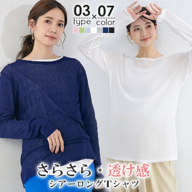 、接触冷感シアーロングT レイヤード シアー トップス tシャツ 5分袖 重ね着 シアー ロンT Uネック インナートップス 無地 クルーネック Vネック 体型カバー UV対策 紫外線対策 レディース