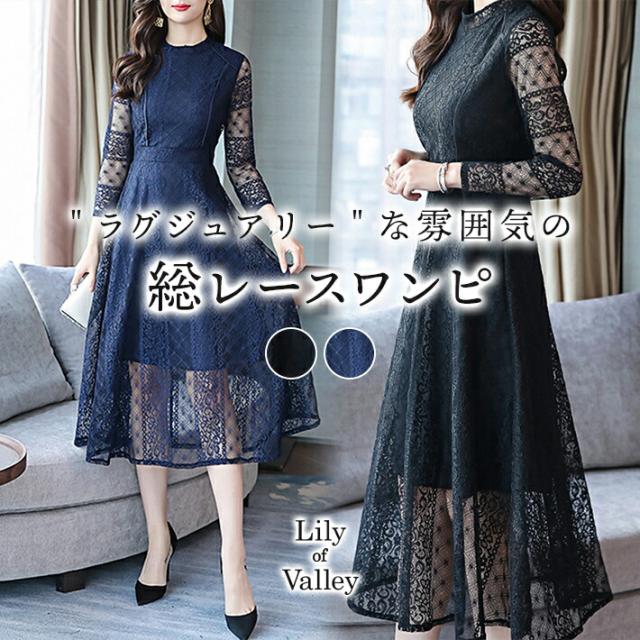 送料無料&即納★ ミディアム丈 総レース ワンピース 清楚 上品 きれいめ 長袖 結婚式 二次会 お呼ばれ / レディース パーティー フレア Aライン ハイウエスト クルーネック 膝下 発表会 演奏会 レース ドレス 大きいサイズ 黒 紺 ブラック ネイビー 秋冬 春夏 春 夏 秋 冬