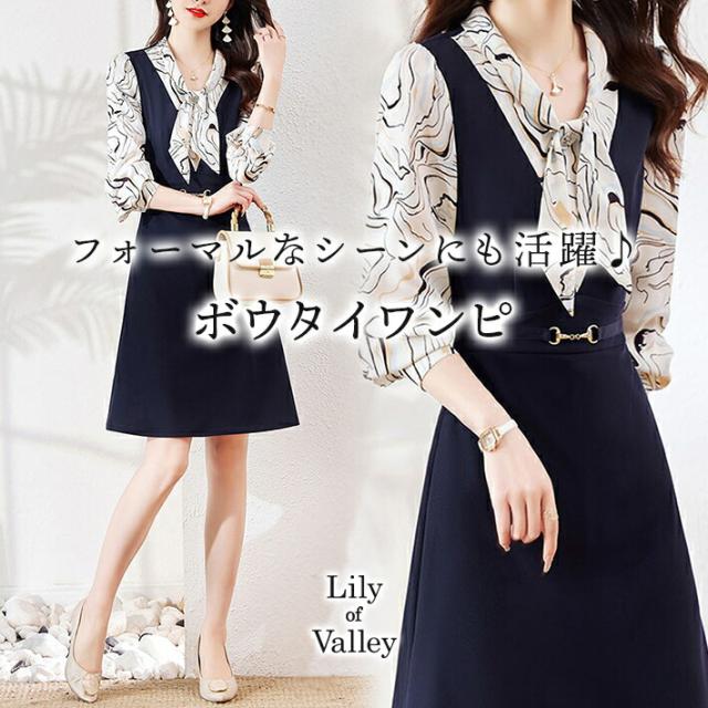 送料無料&即納★ ボウタイ ブラウス ドッキング ワンピース セット 上品 清楚 きれいめ お呼ばれ オフィスカジュアル / レディース トップス 柄 シャツ セットアップ 膝丈 膝上 フレア ハイウエスト オフィス 結婚式 二次会 大きいサイズ Vネック 紺 ネイビー 秋冬 春 秋 冬