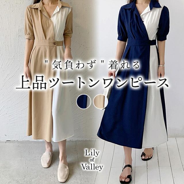 店内SALE!! ミモレ丈 ツートン ワンピース 半袖 シャツ 上品 きれいめ お呼ばれ オフィスカジュアル / レディース 襟付き バイカラー ふんわり Aライン ロング丈 韓国 フレア ハイウエスト オフィス ミモレ 膝下 大きいサイズ Vネック 紺 ベージュ ネイビー 春夏 春 夏