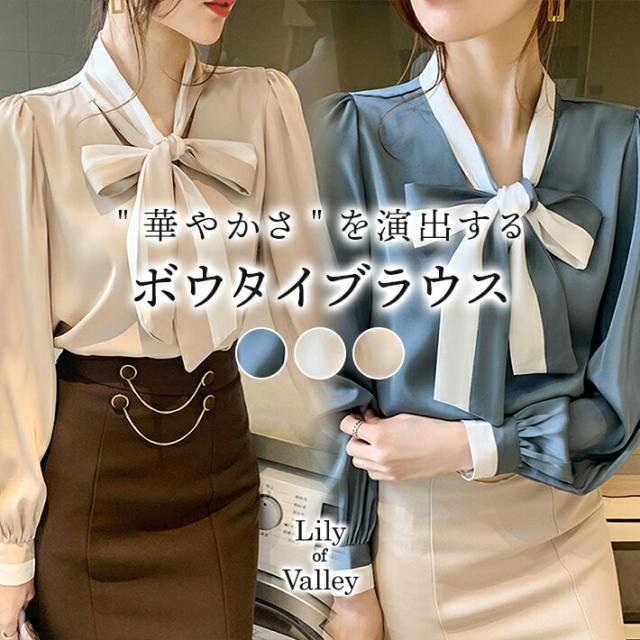 女性らしい華やかさを演出してくれる バイカラー ボウタイ ブラウス/レディース トップス シャツ 二次会 パーティー フォーマル オフィスカジュアル お呼ばれ 大人可愛い 韓国