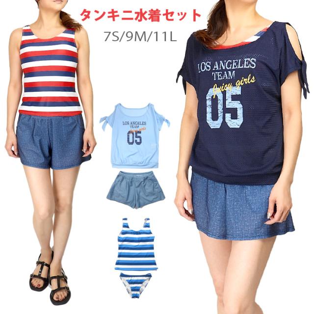 レディース用タンキニ水着4点セット 7S 9M 11L 8404 KT-075 スイムウェア 女性 婦人 Tシャツ ネイビー ブルー No.sw3292