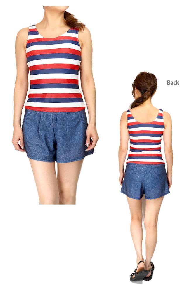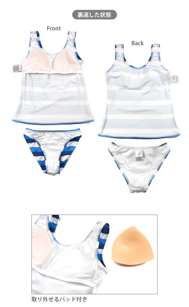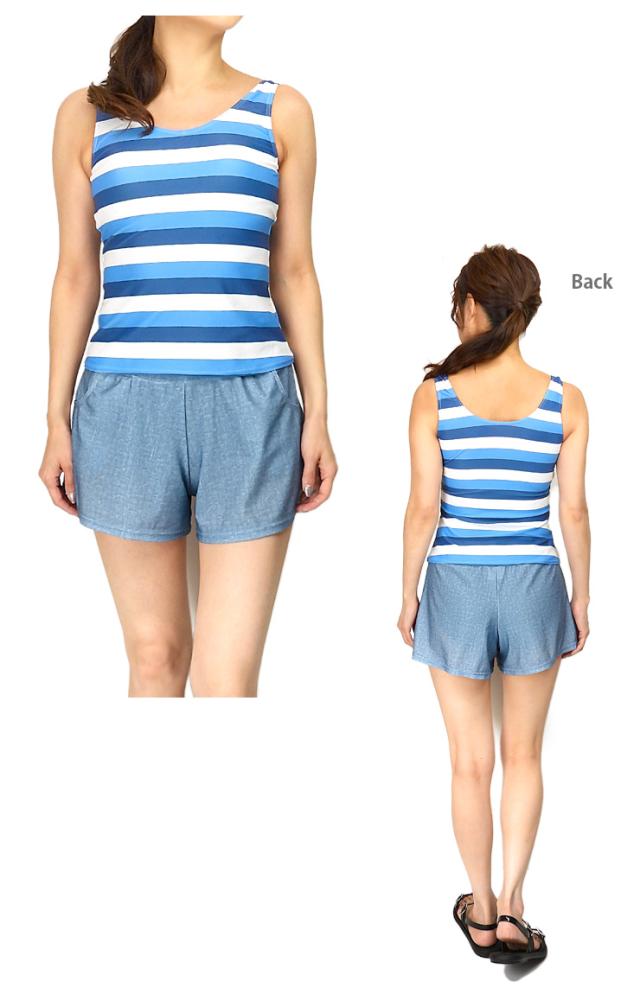 レディース用ボーダー柄タンキニ水着4点セット。