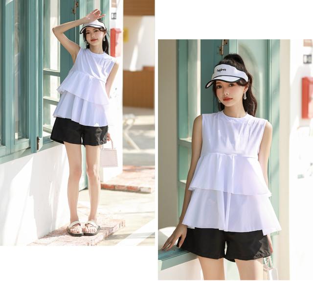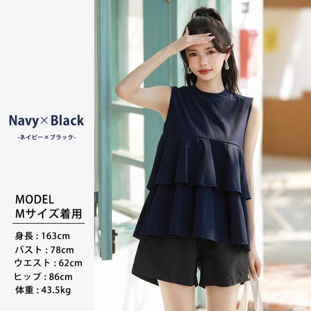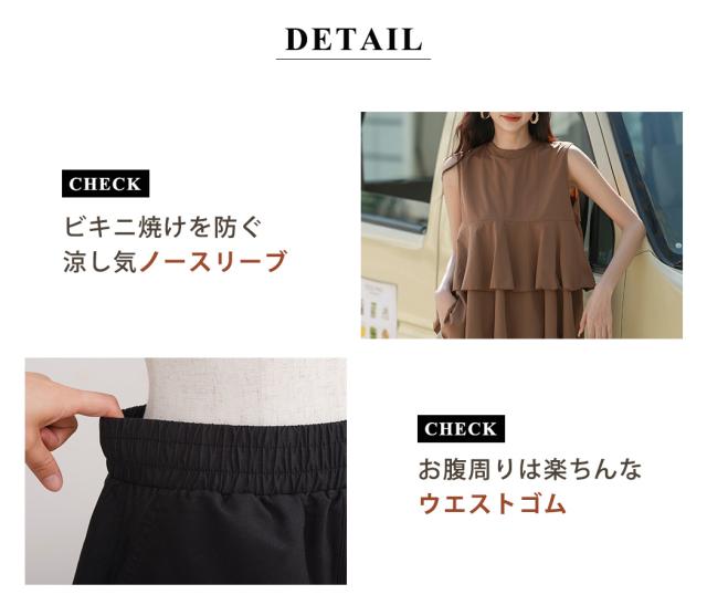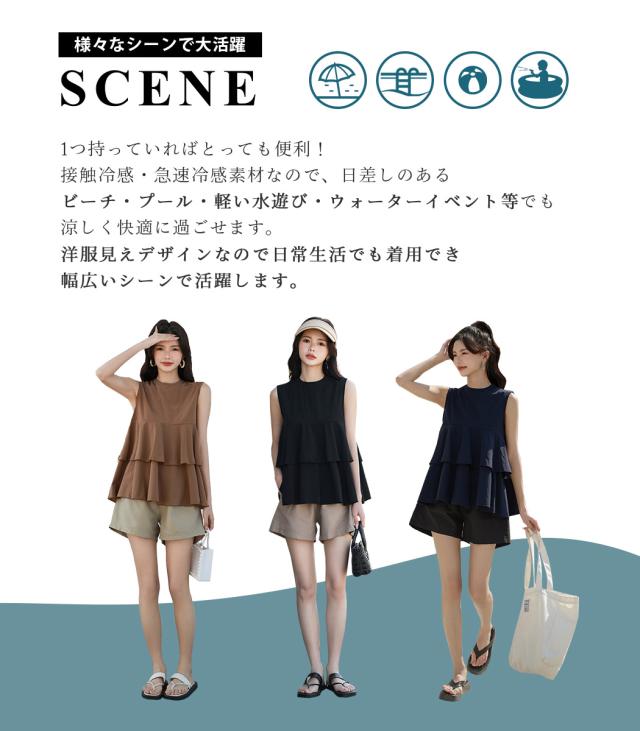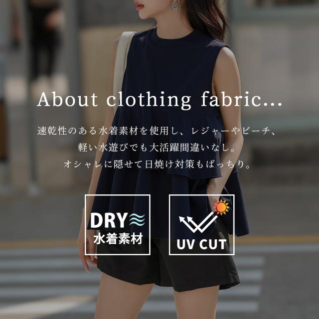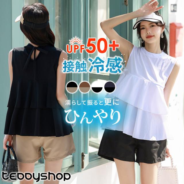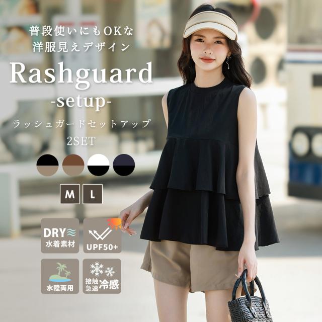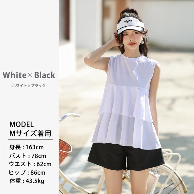 春新作 ラッシュガード レディース ノースリーブ ショートパンツ セットアップ UVカット率 99%以上 UPF50+ 水陸両用 水着 体型カバー おしゃれ かわいい フードなし 薄手 プルオーバー ティアードフリル バックリボン 黒 白 ウエスト ヒップ 太もも カバーアップ